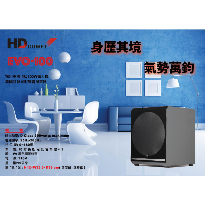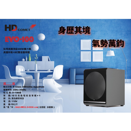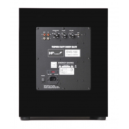 有別於過去EVO-8與EVO-10主動式超低音的音箱結構採用低音反射式設計,這次EVO-100改採密閉式音箱,藉由音箱內部強大的空氣阻尼,可產生更為快速、結實的低頻。密閉式音箱的低頻延伸或許比不上低音反射式音箱,但EVO-100透過內建的D類300瓦功率擴大機,強勁驅動力讓低頻仍能延伸至的25Hz,規格十分優異。